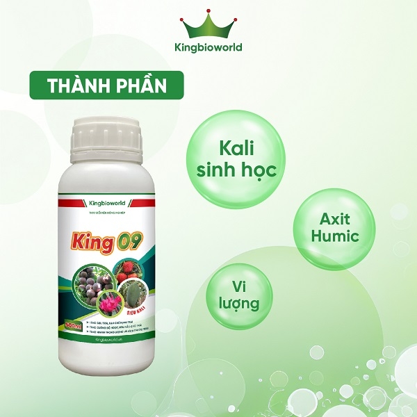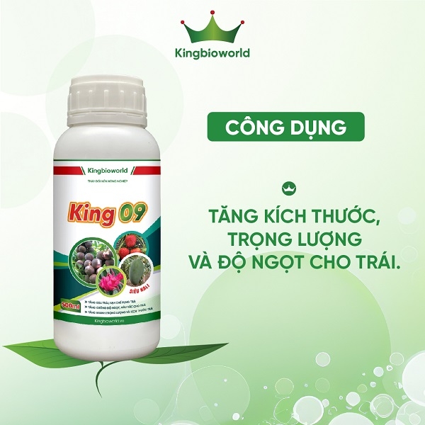 King 09 là sản phẩm giúp tăng kích thước trái (củ), tăng độ ngọt cho trái, giúp đẹp trái, bóng trái. Sản phẩm được sản xuất theo công nghệ vi sinh hiện đại, đảm bảo an toàn cho con người, thiên địch và đất trồng.
