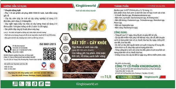 King 26 là sản phẩm giúp giải độc đất, cân bằng pH, giúp kích thích hệ vi sinh vật có lợi phát triển để nuôi đất khỏe mạnh. Sản phẩm được sản xuất theo công nghệ vi sinh hiện đại, đảm bảo an toàn cho con người, thiên địch và đất trồng.