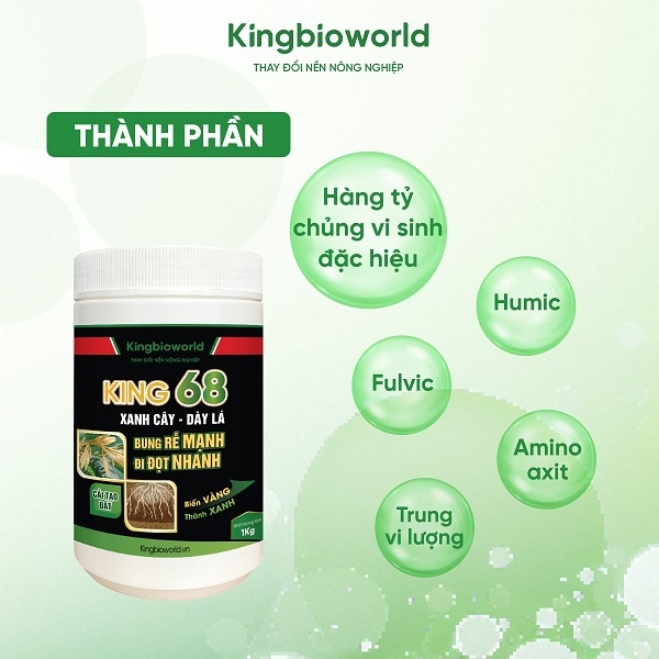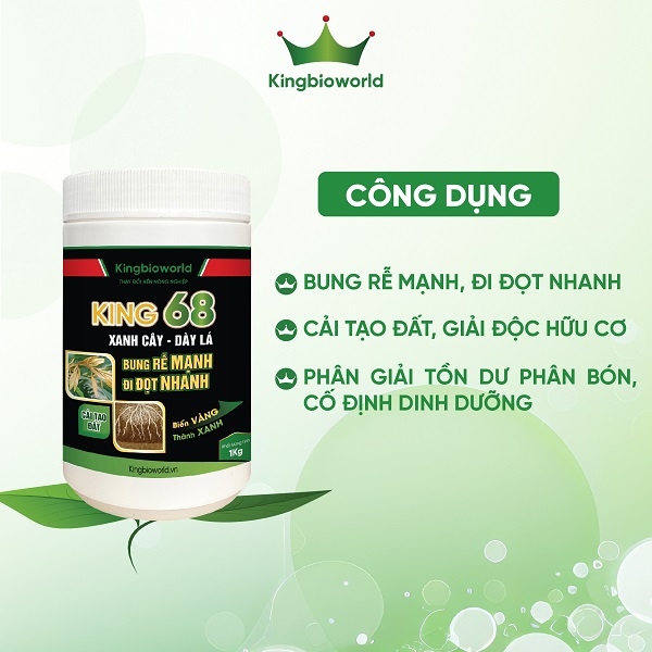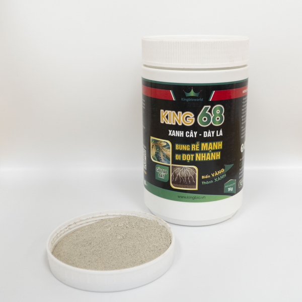 King 68 là chế phẩm sinh học kích thích cây bung rễ mạnh, bật chồi nhanh, phát đọt, cải tạo đất, giải độc hữu cơ. Sản phẩm được sản xuất theo công nghệ vi sinh hiện đại, đảm bảo an toàn cho con người, thiên địch và đất trồng.