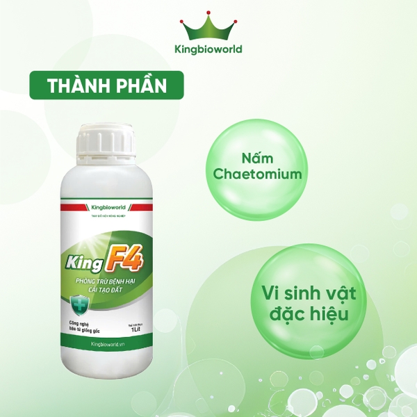 King F4 là sản phẩm chuyên đặc trị nấm bệnh trong đất gây ra các bệnh như vàng lá thối rễ, lở cổ rễ,… Sản phẩm được sản xuất theo công nghệ vi sinh hiện đại, đảm bảo an toàn cho con người, thiên địch và đất trồng.