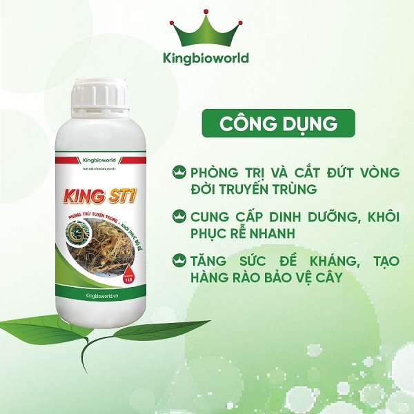 King ST1 là sản phẩm đặc trị tuyến trùng, cắt đứt hoàn toàn vòng đời của chúng, tạo hàng rào hoàn hảo bảo vệ cây trồng. Sản phẩm được sản xuất theo công nghệ vi sinh hiện đại, đảm bảo an toàn cho con người, thiên địch và đất trồng.